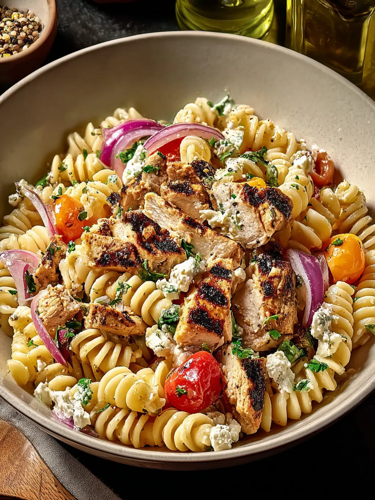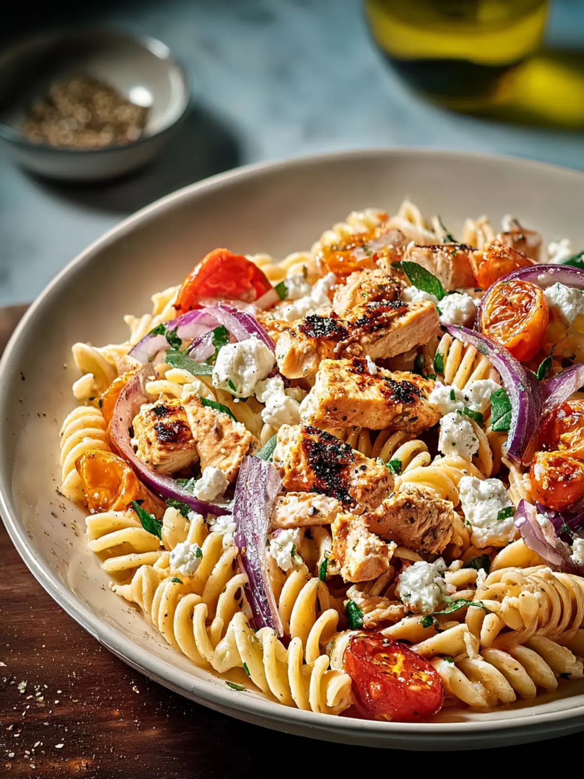 5. In a large bowl, combine pasta, chicken, cherry tomatoes, cucumber, and red onion.