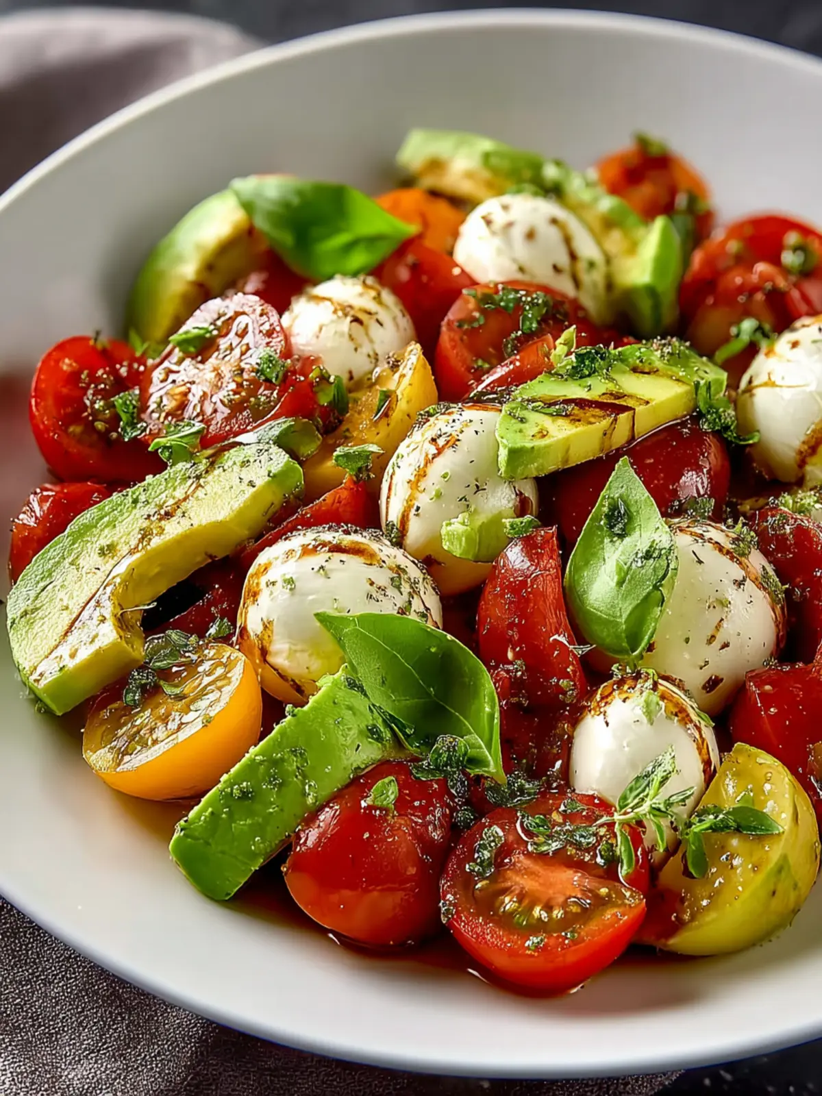 This salad is incredibly versatile! Here are some ideas to enhance your refreshing tomato mozzarella avocado salad: